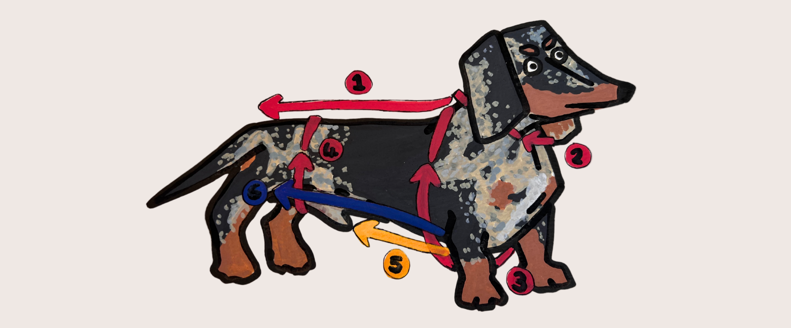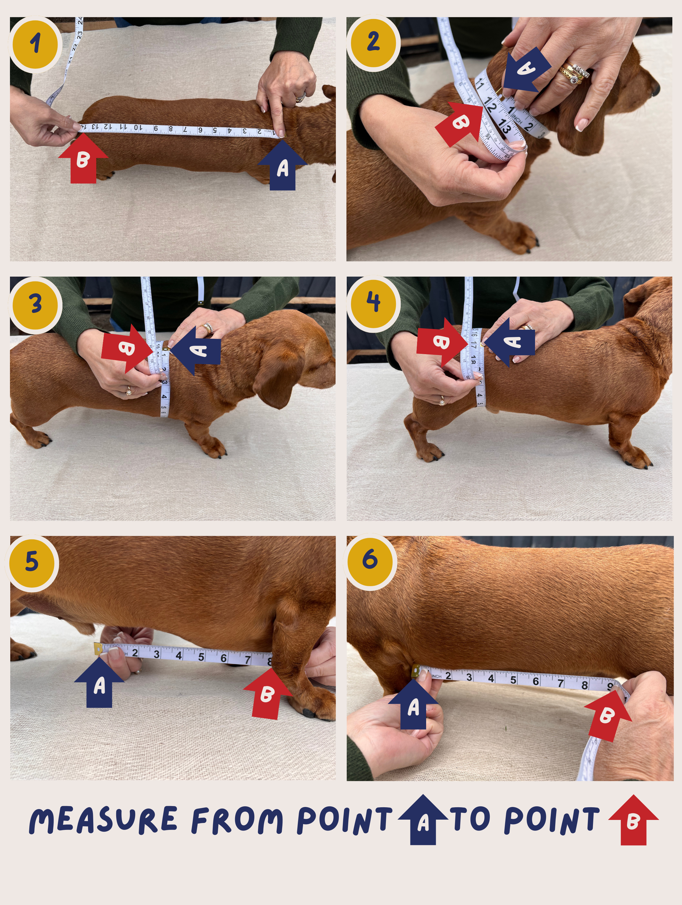 From the back of her front leg to the front of her back leg measure the space between. This ensures we can provide the best tummy coverage.